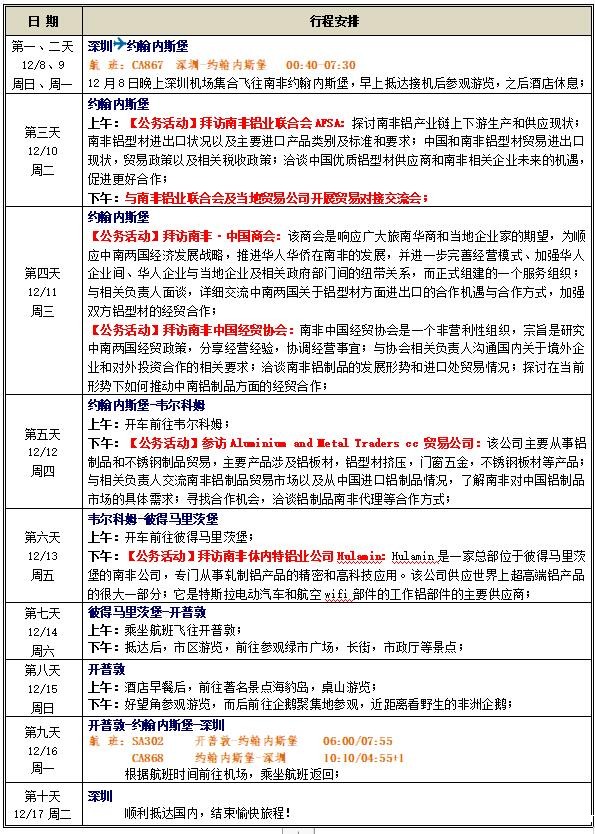 活动内容:出访期间主要任务是加强同南非中国经贸协会、南非·中国商会、南非铝业联合会、南非贸易公司等相关政府机构及商协会和我国驻外经商参处之间的经贸合作,了解投资政策和信息,考察投资市场,与当地企业就经贸对外投资项目进行对接洽谈。同时将参观南非休内特铝业公司(Hulamin)、Aluminium and Metal Traders cc贸易公司,多方了解南非的铝业市场,拓展合作领域;