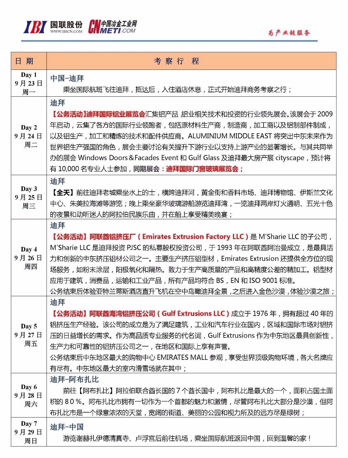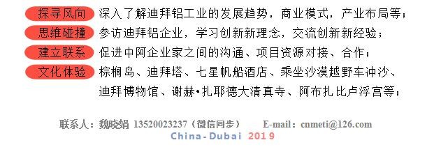在全球经济一体化,世界品牌国际化的今天,我国铝工业一直保持着持续快速发展态势,产量持续增长,经济效益大幅提高,技术进步加快,结构调整取得新进展;随着“一带一路”倡议的提出,中阿两国的往来愈加紧密;“迪拜”作为阿联酋经济贸易发达、人口最多的酋长国,如今已经成为世界三大转口贸易地之一,被称为通往中东和北非贸易的桥头堡。中东地区各行各业对铝的需求量不断增加,随着原铝产能的增加,铝产业链的下游产业铝加工业和铝制品制造业也正在快速发展。为进一步促进我国铝工业与中东企业的交流与合作,中国设备管理协会冶金分会定于2019年9月23-29日赴迪拜铝加工企业商务考察。